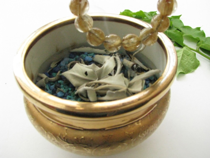 セージや天然のドライハーブに火をつけ、パワーストーンを持って、煙でいぶします。